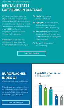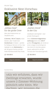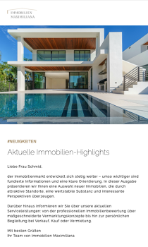 Sie wählen die gewünschten Immobilien direkt im Newsletter-Editor aus, mail2many erstellt vollautomatisch perfekte Artikel. Mit Titel, Fotos, Beschreibung, Preis, Größe, Lage und allen Pflichtangaben (z. B. Käuferprovision und Energieeffizienzklasse). Die Daten gelangen aus Propstack, FLOWFACT oder onOffice in den Newsletter. Das spart Zeit und garantiert maximale Datenqualität sowie rechtliche Korrektheit bei jedem Versand.